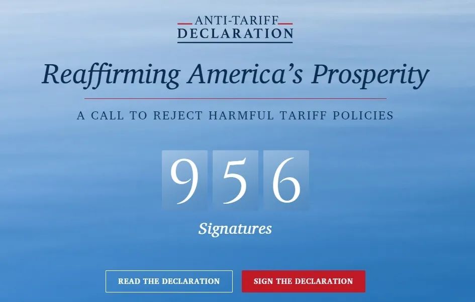 截至美东时间4月19日晚,已有956人签署这份“反关税宣言”。